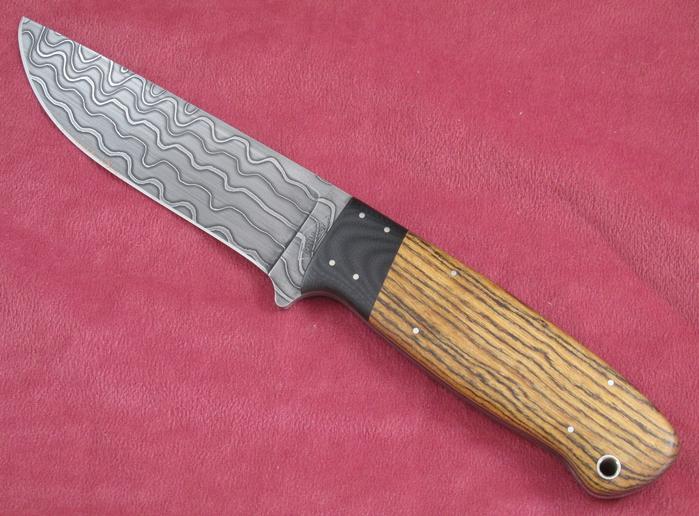 #23 The skinner pictured below has a blade of Alabama Damascus, cut from a large billet, profiled, hollow ground,